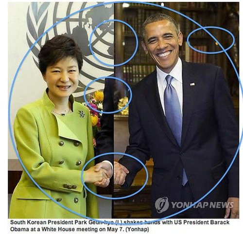 美媒調侃韓聯社合成樸槿惠(左)與奧巴馬握手照。(網頁截圖)韓國總統樸槿惠與聯合國秘書長潘基文握手照(資料圖)近一個多月以來,朝鮮半島出現緊張對峙局面,韓國總統樸...">